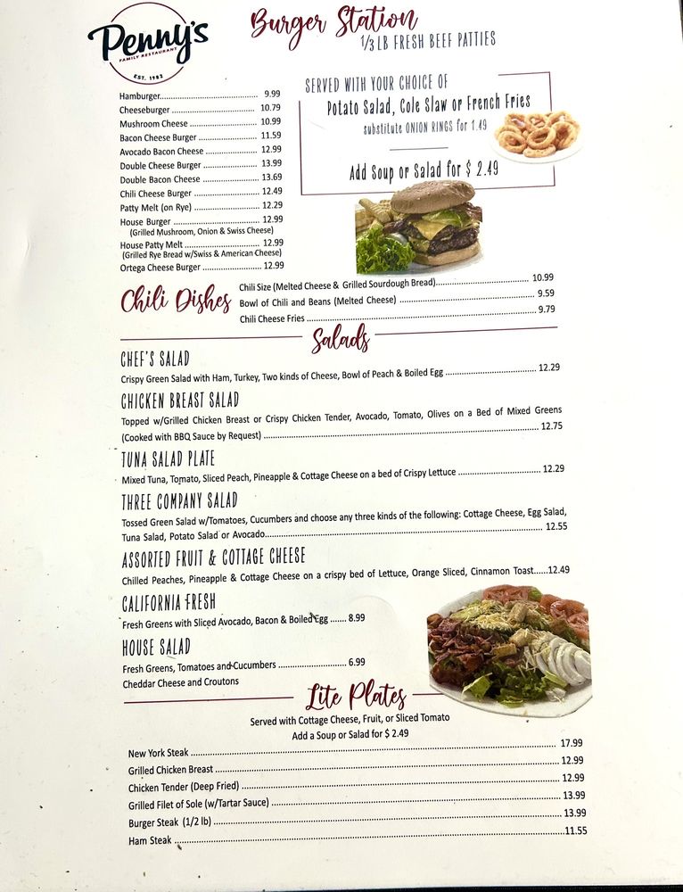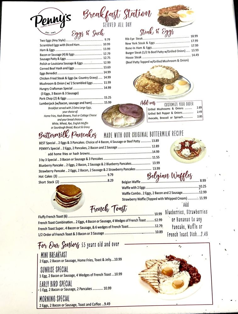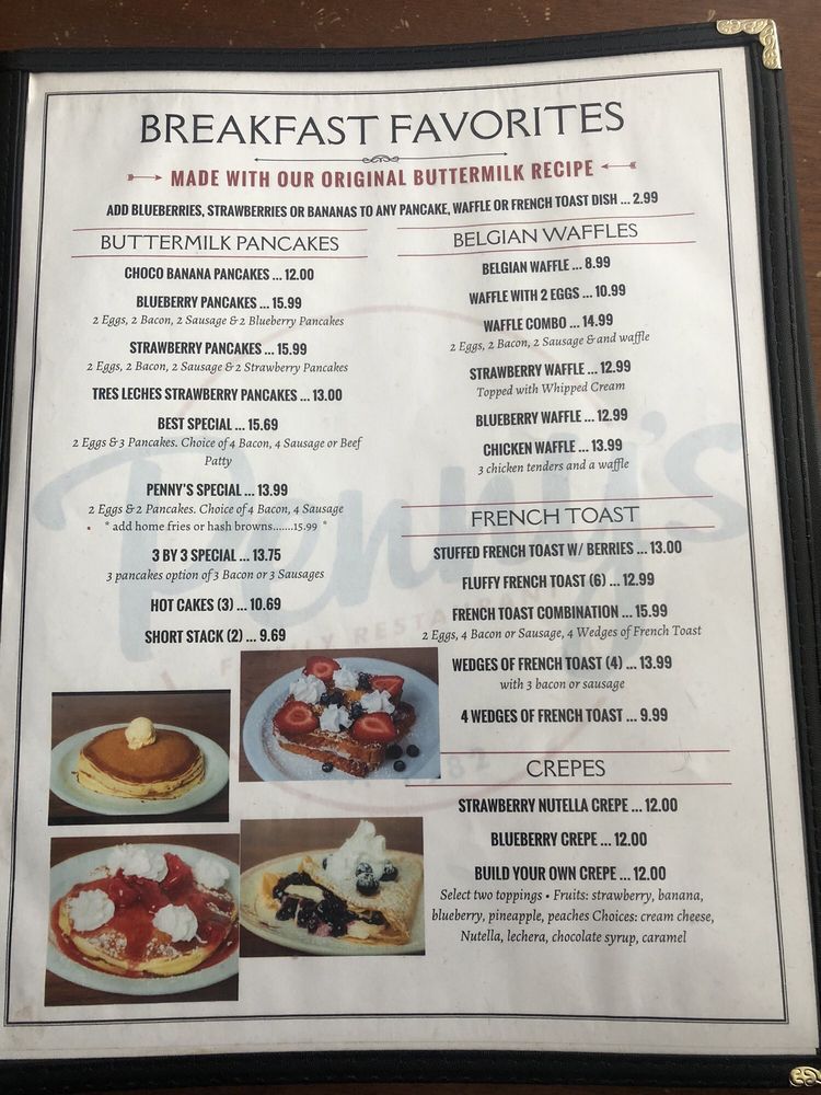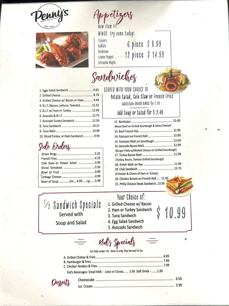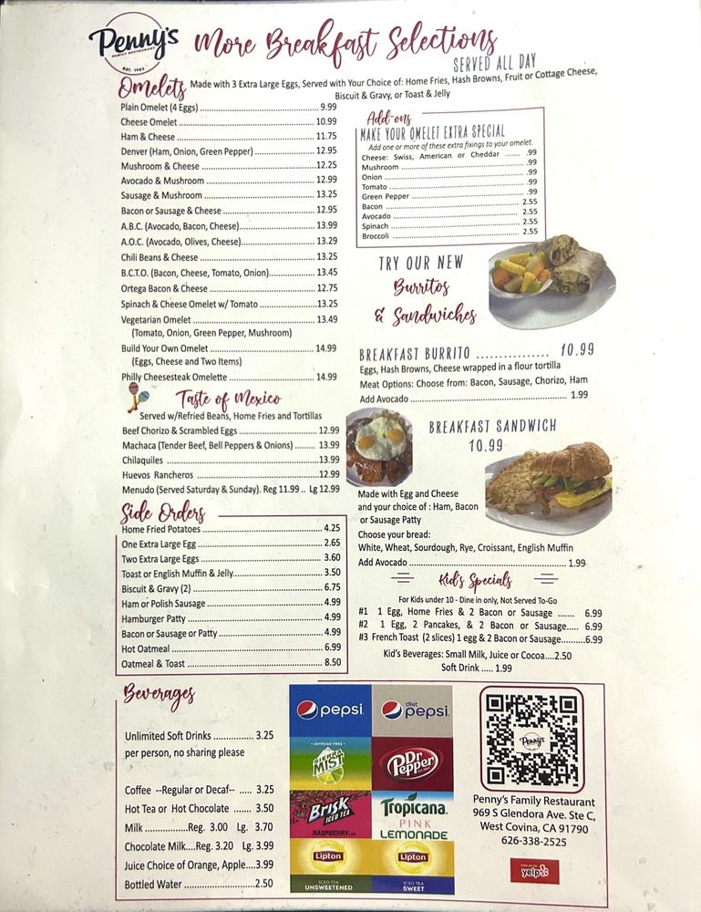 Penny's Family Restaurant in West Covina, CA offers a cozy mom and pop ambiance combined with delicious comfort food. Customers rave about the mouthwatering bacon and eggs breakfast plate, fluffy pancakes, and flavorful chilaquiles. The menu boasts a variety of options, from 6 or 12 piece wings to customizable half sandwich specials with add-ons like avocado and bacon. Prices range from $13 to $16 per plate, offering generous portions that leave diners satisfied. The staff is friendly and attentive, providing impeccable service in a welcoming atmosphere. With a classic diner feel, Penny's is a must-visit brunch spot for families and breakfast enthusiasts alike. Make sure to stop by and experience the perfect breakfast at Penny's Family Restaurant.